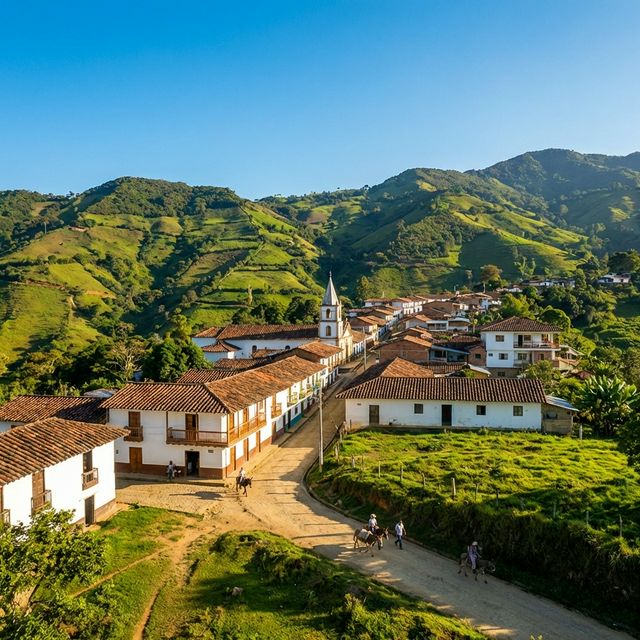 A peaceful Andean village set among high mountain peaks and lush green slopes.