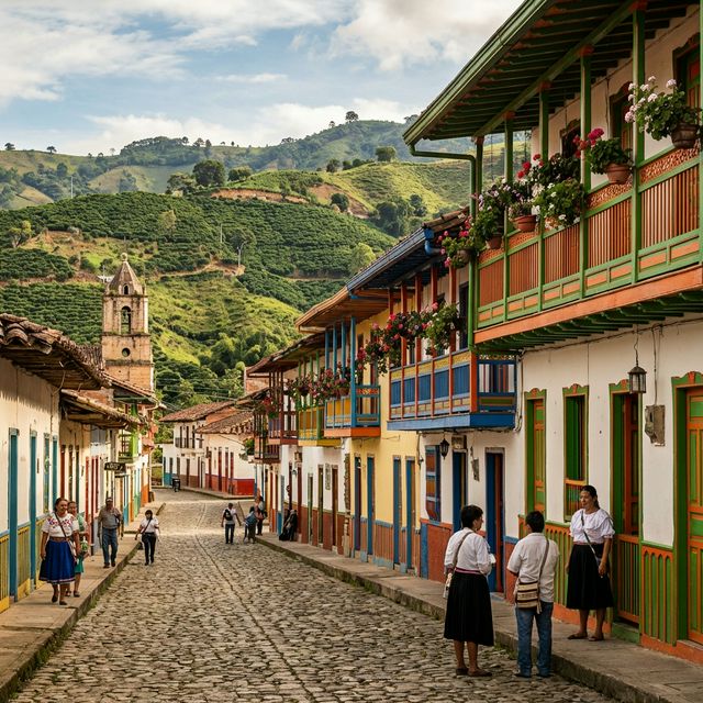 A traditional rural town in the coffee region of Antioquia, featuring colorful balconies and nestled among lush hills.