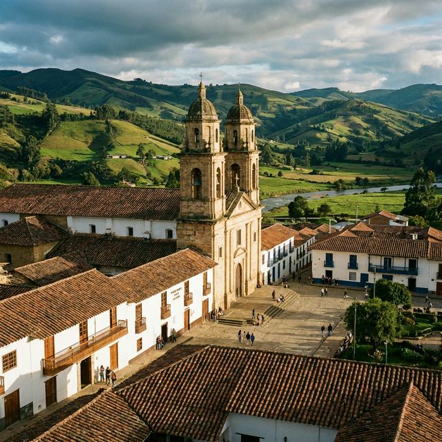 A peaceful colonial town with a grand plaza and beautiful Andean rolling hills.