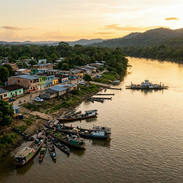 A bustling river port on the Caguán River, blending commerce with the spectacular sunsets of the Amazonian plains.
