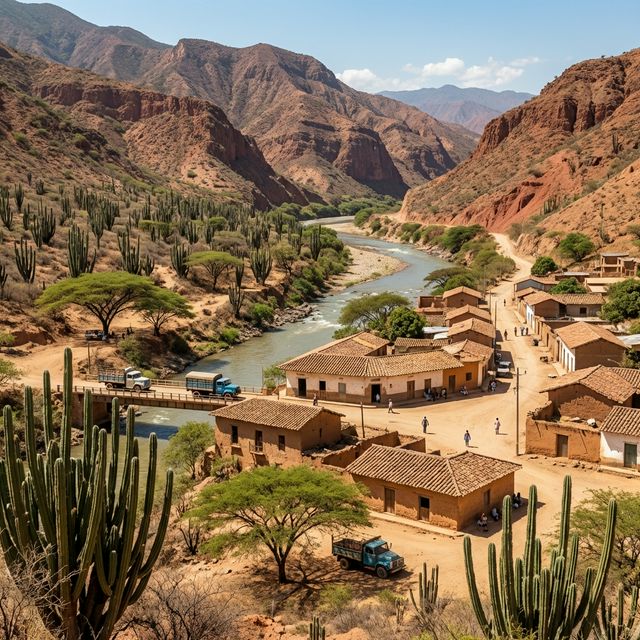 A hot dry valley town on the Patía River with cactus scrubland, traditional architecture, and dramatic canyon landscapes.