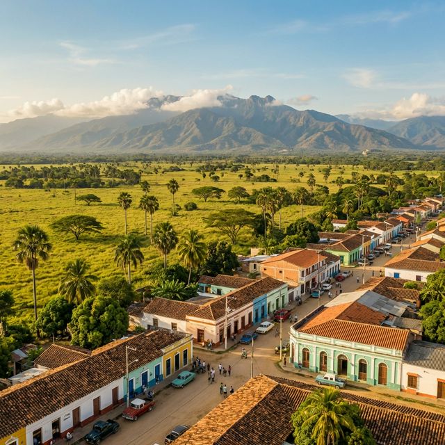 A tropical agricultural town surrounded by savanna and palm trees at the foot of the Sierra Nevada de Santa Marta.