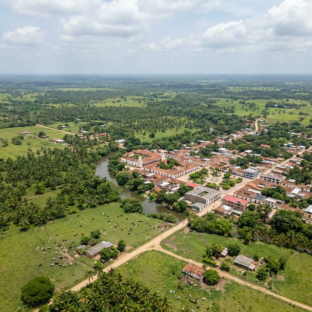 A tropical lowland town in the Magdalena Medio region surrounded by palm plantations and rolling grasslands.