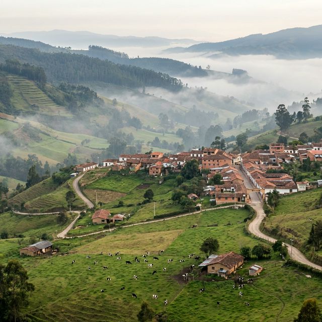 A highland sanctuary surrounded by lush dairy farms and rolling green hills, often dusted with the characteristic Andean morning mist.