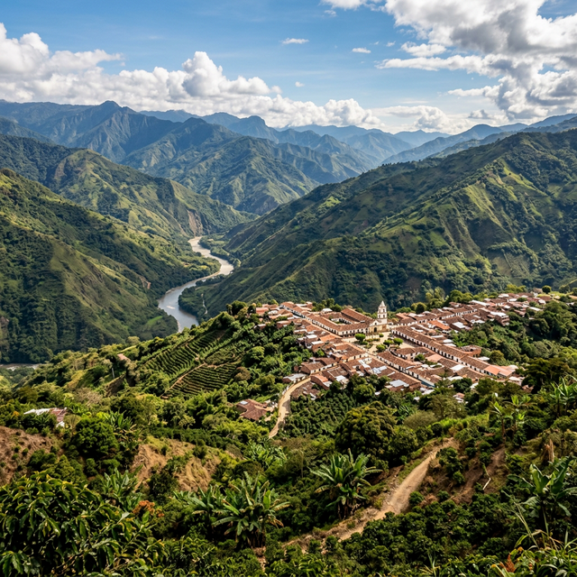 A warm-climate mountain retreat nestled in the Bogota River canyon, known for its lush tropical vegetation and coffee plantations.