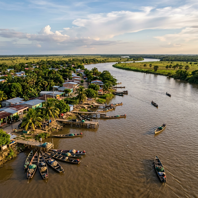 A serene river port on the Meta River, where the vast plains meet the water, known for its traditional fishing and authentic llanero hospitality.
