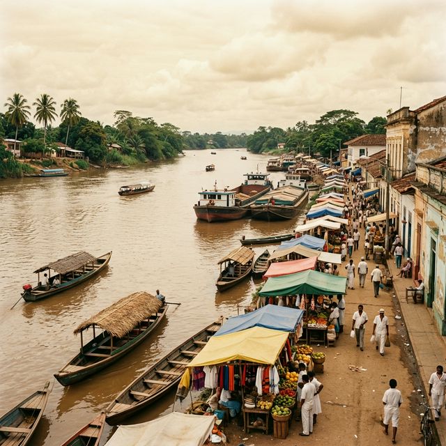 A vibrant tropical river port at the northern edge of the department, where river culture and commerce meet under the sun.