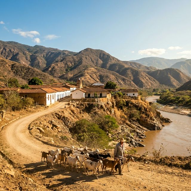 Perched on the banks of the Chicamocha River, known for its hot climate, goat breeding, and strategic mountain location.